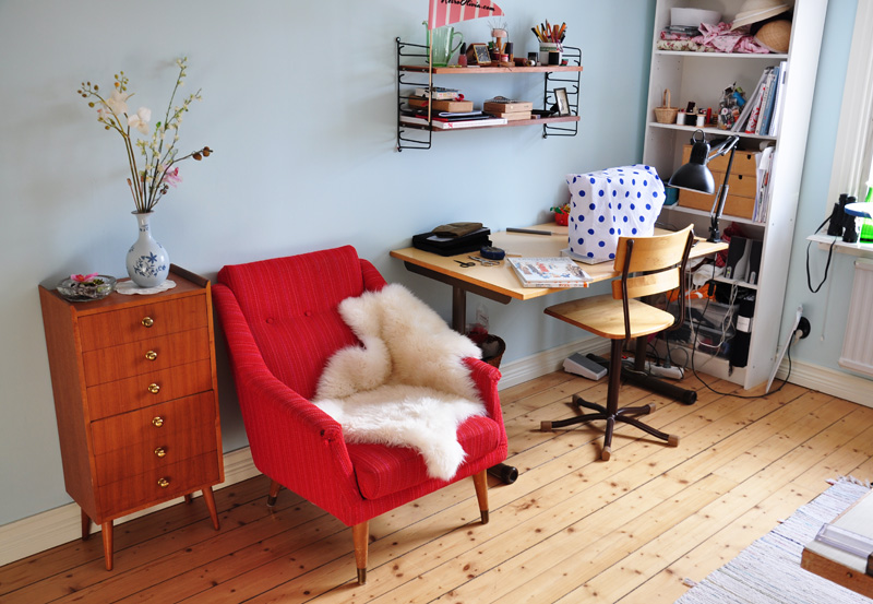 /I rearranged the furniture in my sewing room the other day. From the living room I took the small red chair and placed it here instead. It’s a very nice addition to the room, a cozy place to sit while thinking about what next to make or just taking a break from the sewing machine. I just love this room, not only is it my special place to be creative but the light in this room is quite spectacular. The evening sun shines through the window and outside I have the view of our fields where my horses will graze in the future. Very lovely indeed and I’m grateful for every second I get to spend in there./