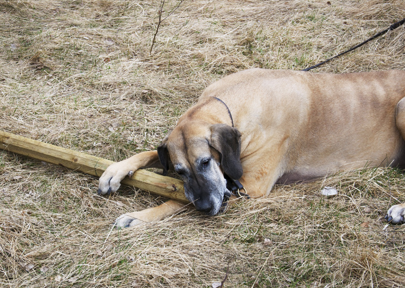 Stella var med och hittade givetvis en stolp hon också. Precis i Grand danois-storlek vad gäller tuggben tydligen. Men hon fick inte ha den länge, det är ju inte så bra att få i sig tryckimpregnerat trä som hund med känslig mage och dessutom behövde vi ju den till staketet.