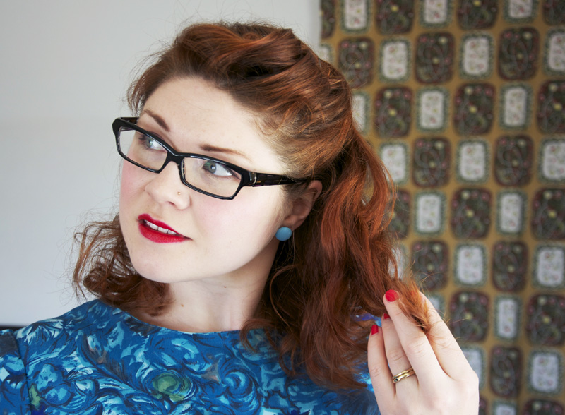 I går avbröt vi utomhusfixet med att dra på finkläderna och gå på vårkonsert med blåsorkestern. Det råkade dessutom vara samma blåsorkester som jag var med i en gång i tiden så det blev inte bara en musikupplevelse utan även en rejäl nostaligitripp. Jag ville verkligen mana fram vårkänslorna och tog den knallblå klänningen som jag hittat i mormors garderob. Jag matchade med turkosa örhängen i vintageglas som jag knåpade ihop för några år sedan.