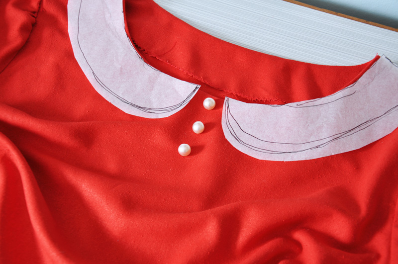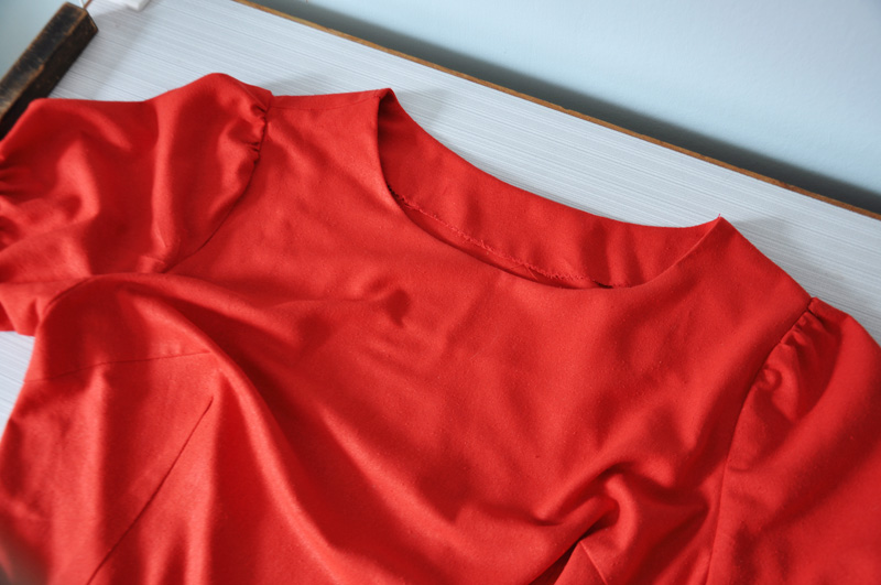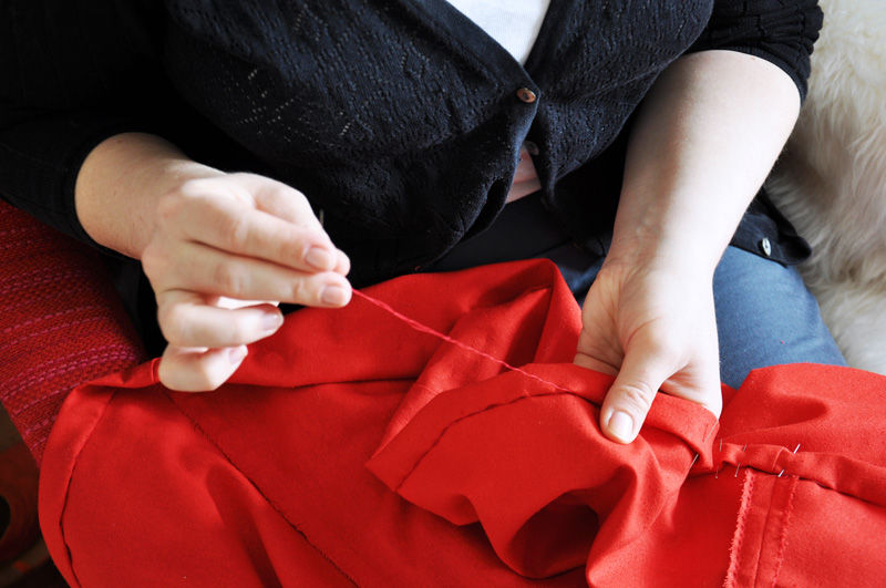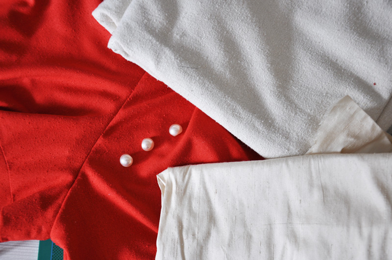 /Today is spent in the sewingroom. I making the finishing touches on my red dress in raw-silk that I’m going to wear tomorrow when we finally go to the concert with Max Raabe & Palast Orchester. I couldn’t decide on what sort of collar to make so I just made a round neckline with the intention to make a loose-collar instead, in order to keep things flexible for someone who has difficulty deciding on things. Now I just have to decide if I shall make the collar in the silky Dupion or in the white raw silk (same quality as the dress), tricky, tricky…../