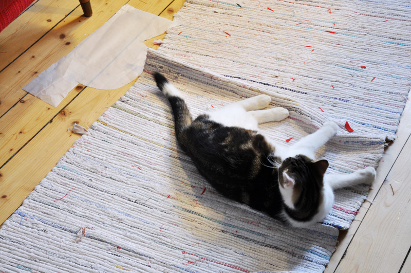 Jag fick sällskap av katten som älskar att trassla till trasmattan åt mig och riva ned mina mönsterpapper. Men det är ju alltid trevligt med sällskap så det gör inte så mycket med oredan.