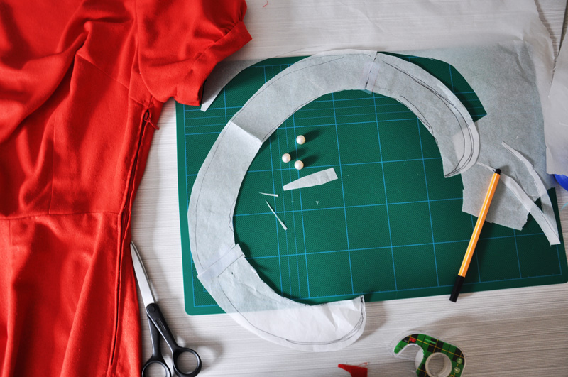 När man inte kan bestämma sig hur man vill ha det är det en smart sak att göra diverse lösa attiraljer att fästa på klänningen, så man kan byta allteftersom lusten faller på. Så jag tänkte börja med att göra en lös vit dock-krage som kan fästas i halsringningen. Om jag dessutom gör ytterligare  klänningar med samma rundning i halsen funkar den till flera.