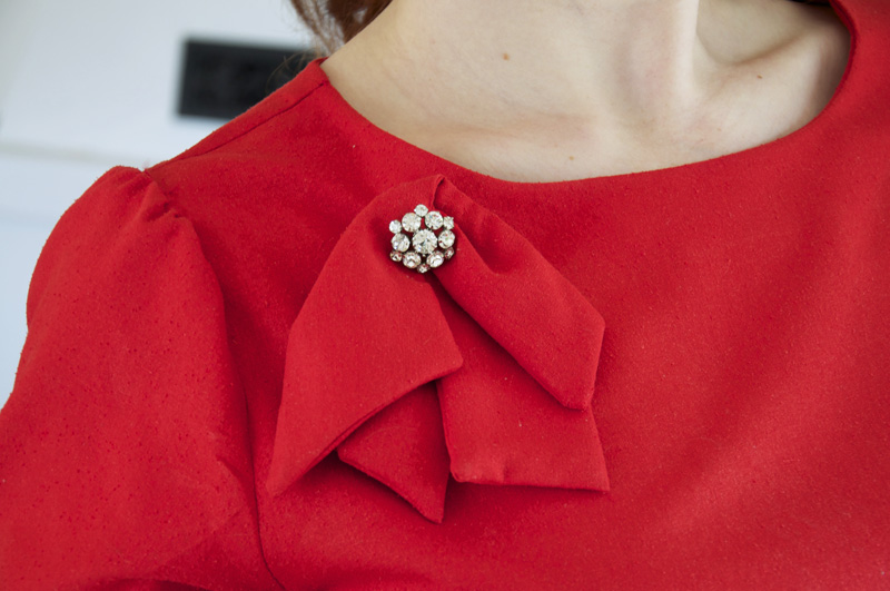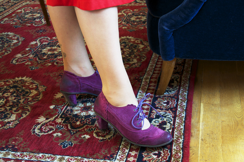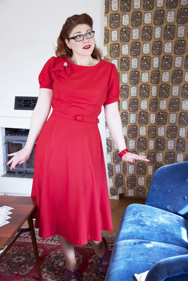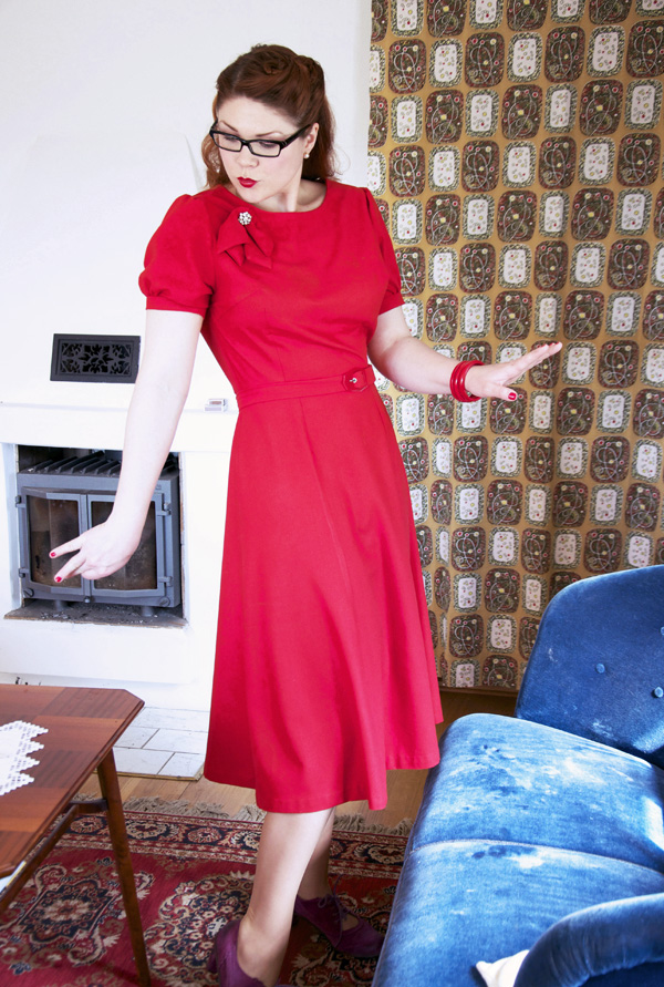 /This is my outfit that I wore at the Max Raabe-concert last friday. I decided to skip the white collar-idea and go with a more elegant look adding a bow instead. I sewed a brooch-needle on the bakside of the bow so it’s easy to move or remove and I also added the rhinestone-brooch that my husbands grandpa gave me for some extra bling. I thought the Vega-shoe from Dkode was perfect match for this look, allthough this is an after construction. On the concert I actually wore my red Vega’s but I later realized that the purple ones looked rather great as well. A lovely dress and I’ll be sure to make more in the same style./