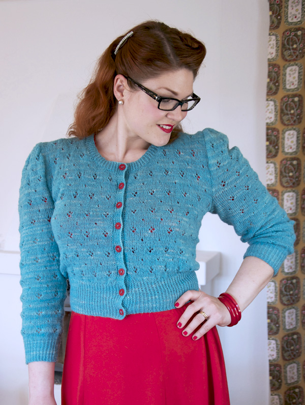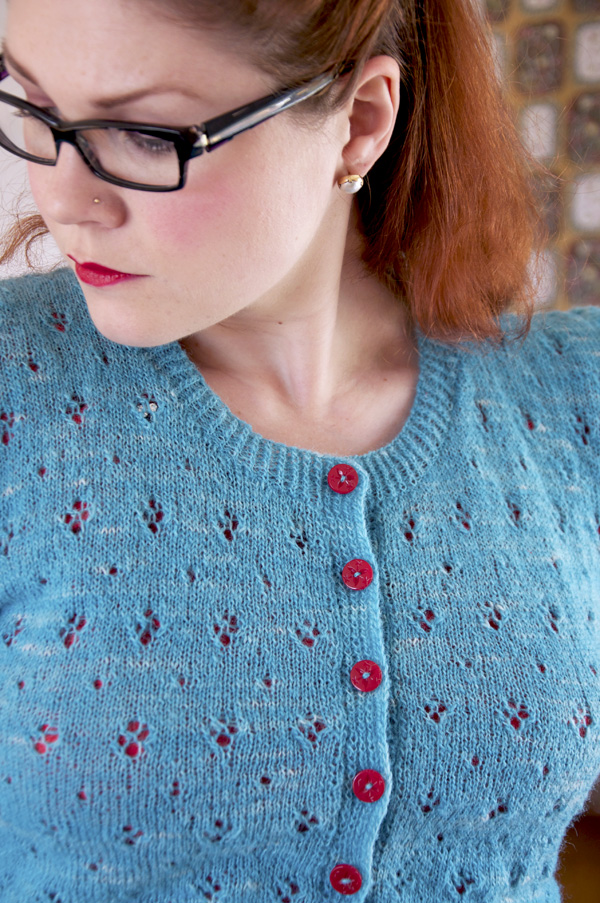 kattfotDen är stickad i det här garnet och modellen heter Kattfot, efter mönstringen som kallas kattfots-mönster. Den har precis rätt mängd puff i ärmen och lagom djup ringning så man lätt kan visa lite av sin bluskrage om man vill. Det här kommer bli min andra tröja i den här modellen, tidigare hade jag en röd som jag slitit ut ordentligt eftersom jag älskade den så mycket. Jag ville förnya mig lite vad gäller färg och valde därför den här klatchigt turkosa, eftersom jag inte kunde hålla mig från favoritfärgen helt valde jag de här röda 40-tals knapparna som jag fyndat på ebay.  De riktigt lyser som karameller mot det turkosa och man blir glad bara man ser dem. Garnet är vårt entrådiga spunnet av finull, mjukt och gosigt och den här tröjan kommer bli en stor favorit. Precis som dess föregångare.