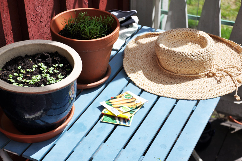 Dagen blev allt eftersom mer solig och mina örter trivdes i sina krukor. Solhatten fick efter lunch följa med ut på fältet för vid det laget gassade solen rejält.