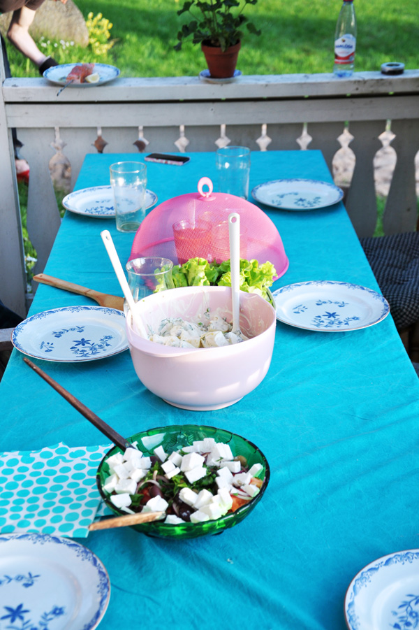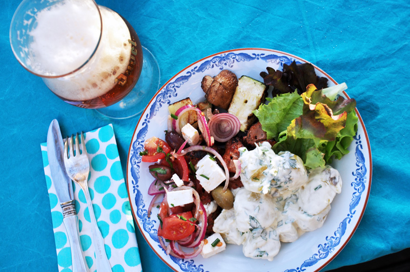 Det blev en rackarns god middag som belöning efter granarna. Fattas bara att man inte utfodrar sina små arbetsbin ordentligt när man bjudit in dem till gransättar-helg. Det blev marinerade lammspett, min favorit potatis-sallad (med majonäs, grekisk yogurt, dijonsenap, kapris, gräslök och persilja) tomat, oliv och fetaostsallad och lite diverse grillade grönsaker till det. Bara favoriter och så ska det ju vara när man har vännerna hemma på besök.