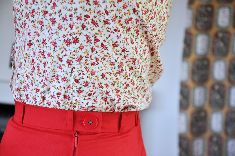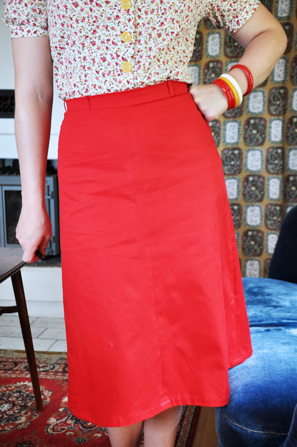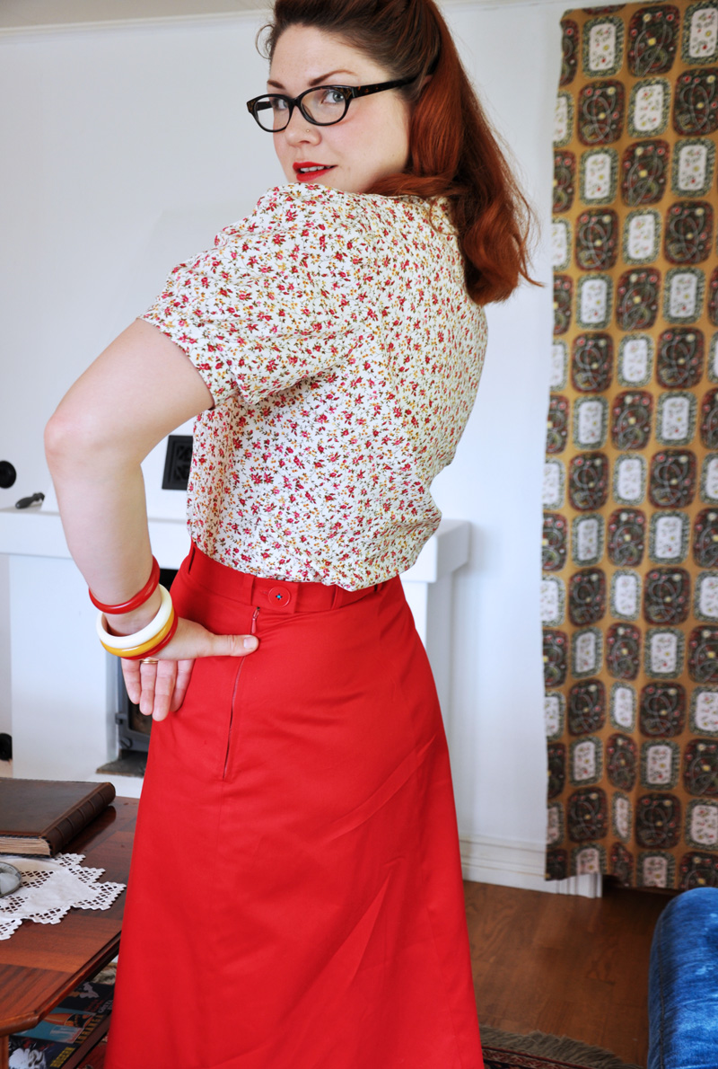 Jag insåg för några dagar sedan att jag har en total brist på A-linjeformade kjolar i garderoben. Nog för att pennkjol är toppen men ibland vill man ju ha variation. Så jag ritade om pennkjolsmönstret till den här och klippte snabbt ut delarna i ett lite tjockare rött bomullstwill. Det gick av bara farten och samma kväll var den färdig så när som på fållningen. Älskar när det går snabbt från idé till färdig vara! (Älskar föresten kombinationen rött, vitt och gult som jag har på mina bakelitarmband. Jag får sådana isglassvibbar, väldigt somrigt.)
