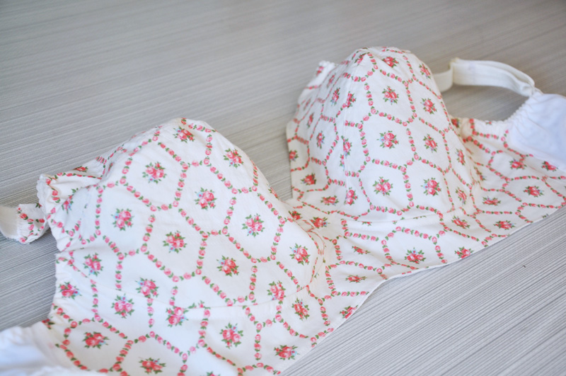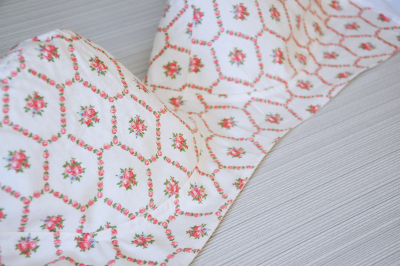 Efter att jag sydde min första bullet-bra var jag tvungen att göra en till, det blir nästan alltid så med mig. Jag blir så taggad att jag måste göra en till, och sen kanske en till och en till…. Den här gången blev den perfekt efter några ändringar på mönstret. Jag använde mig av ett 50-tals tyg som jag hittade i mormors garderob där hon sparat minsta lilla stuvbit, något som jag verkligen uppskattar. Rosa rosor på vit botten, skirt och romantiskt och riktigt bra kvalitétsbomull sådan som de gjorde förr. Det var inte en vidare stor bit tyg som fanns, men det var iallafall så pass mycket att det räcker till ännu en bh eller kanske en matchande gördel. Härligt, härligt!