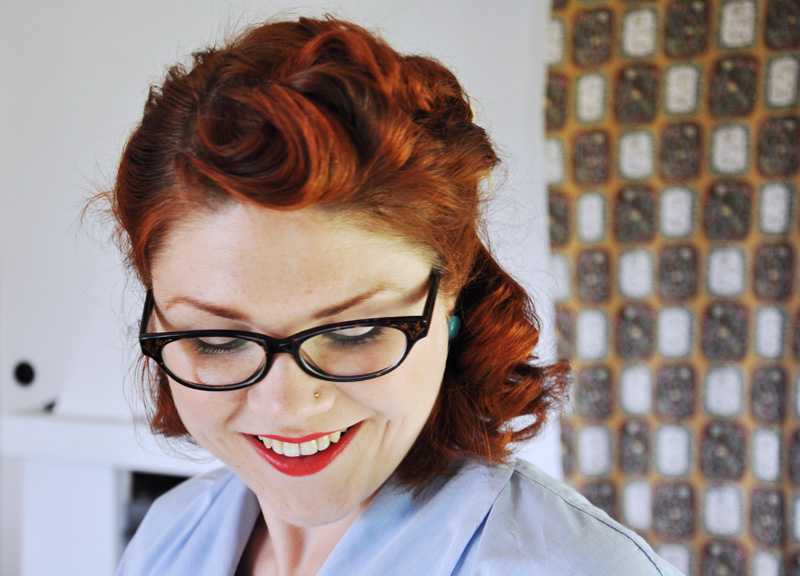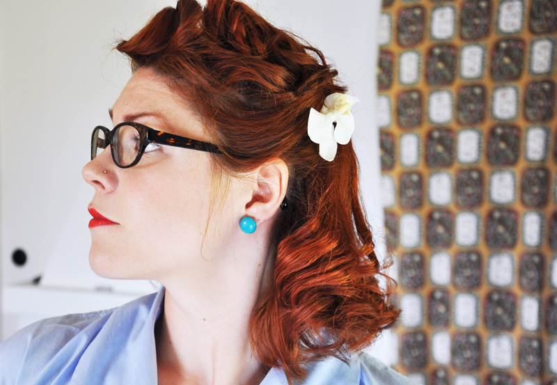 /This is my standard-hairdo at the moment. Pin-curls that I hardly brush out and a messy updo in front, sometimes a little less messy with some standing pincurls but then again sometimes more messy like this time. It’s nice with a do that will work in the summer breezes without looking to out of shape. To save the hair I like to make the pincurls without any setting lotion, instead I just use oil of some sort, it nourishes the dry ends and keeps the hair from getting frizzy./
