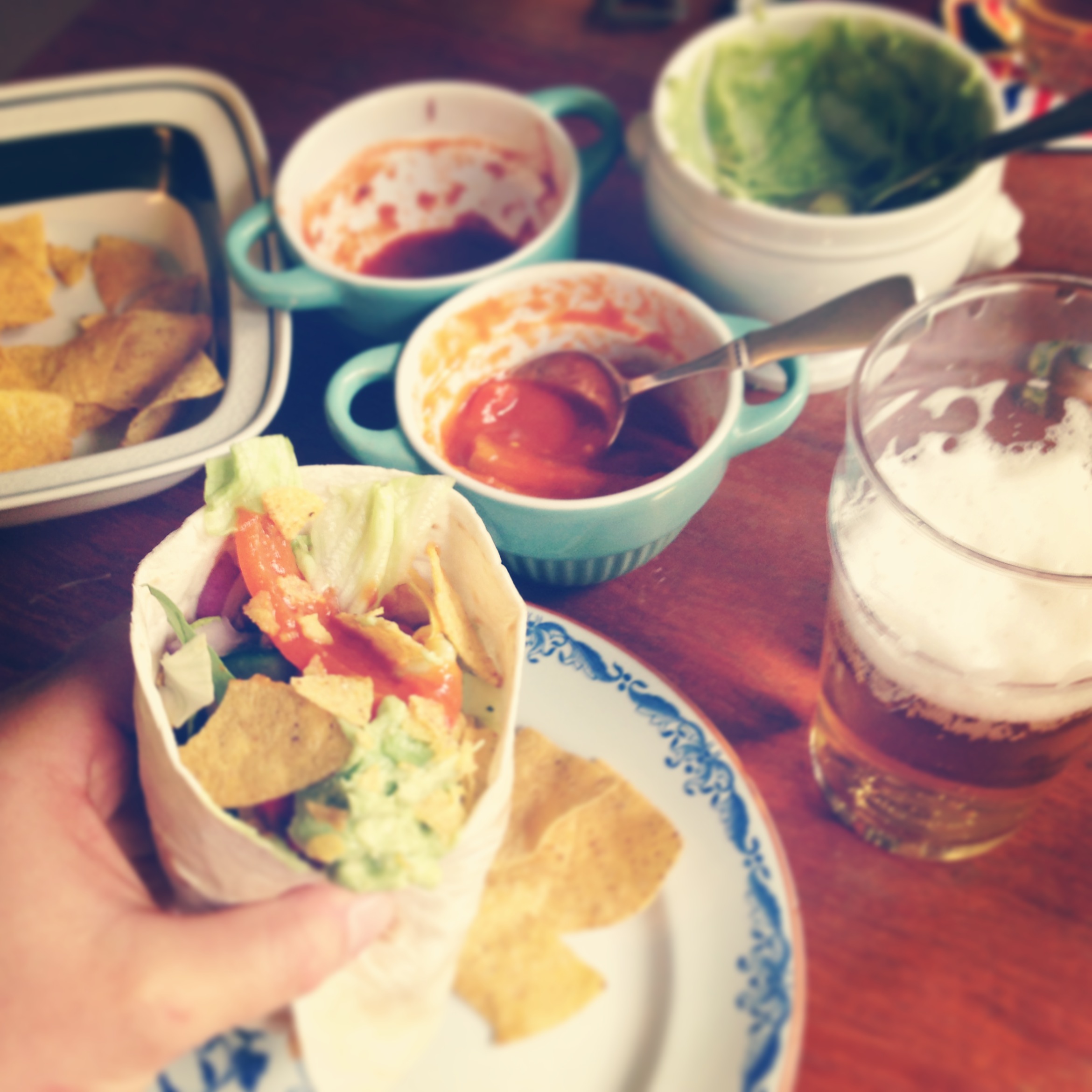 Vi åt burritos till middag en dag och jag åt så jag nästan fick ont i magen, men så är det ju otroligt gott med. Så sydde jag lite förstås, den blå omlottklänningen visade sig bli en hemma-favorit den också.