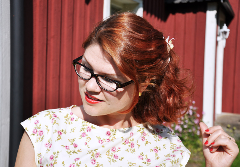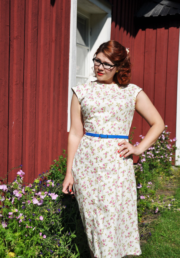 /I got the feeling for making something simple so I altered my pattern some and made a capsleeve-dress. I finally chose to make something of this cream cotton with rose pattern. I have had it in my stash for a couple of years but now it was time. I like that the fabric is the main thing and the model simple. The blue buckle is a flea market find that quickly became a favorite. It seems to go with everything at the moment./