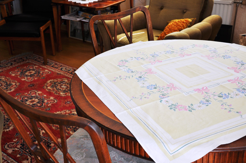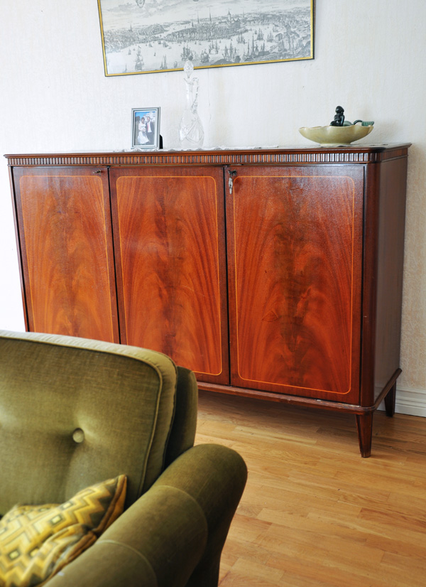 /Finally we got the time to dig out this cupboard from storage and move it to our livingroom. It really tied the room together and it was nice to store the fine-china somewhere safe instead of the moving-boxes I kept them in waiting for a better place. The cupboard is a 40s piece  that comes from my grandmothers house and it’s in the same serie’s as the table. At last the living room is getting more the way I like it, for some reason it has been the hardest room in the house to get in order. But maybe that was because I had the wrong furniture. The green sofa and chair was a gift from a friend of my mothers, I love them, so comfortable and the perfect dark color for the cosy vintage living room I was aiming for/.