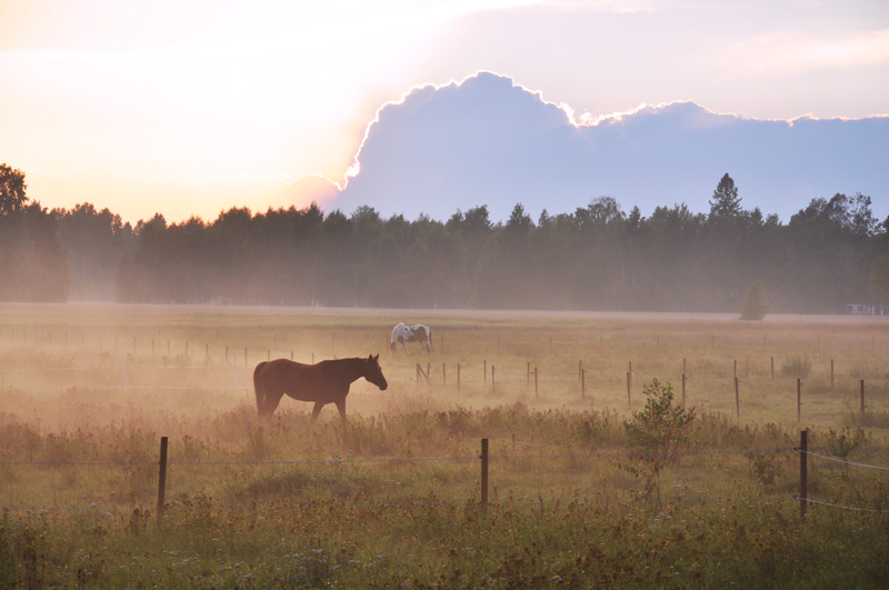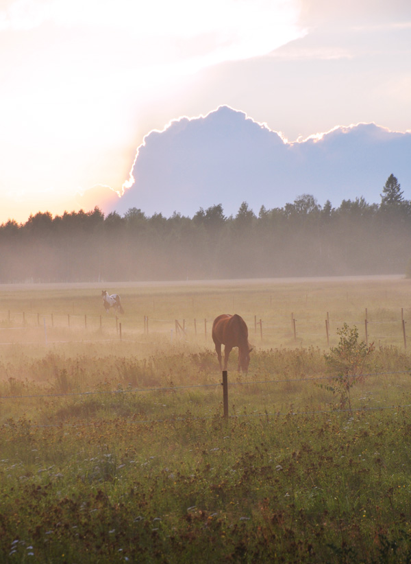 Vi har haft några riktigt fina sensommarkvällar på det senaste. Efter dagens regnskurar kommer till sist solen fram och ger de mest fantastiska solnedgångar som vi avnjuter från verandan. Dimman ligger som en slöja över hästhagarna där Ruby och Kansas betar förnöjt. Det är otroligt vackert, det värmer i hjärtat och jag ler när jag ser mina älsklingar där ute.