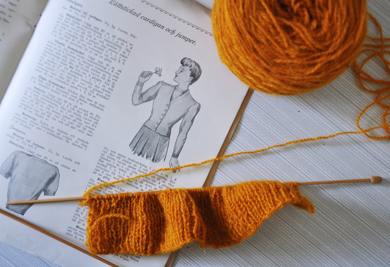 /After taking a long break in knitting due to an inflammation in the wrist-muscles I finally decided to end the break and try to knit again. I just couldn’t resist after I got this lovely knittingbook from -47 from a friend. So with a timer that keeps me from knitting to long at a time to spare the wrists I have slowly started to knit a cardigan. I have been craving a mustard cardigan for a long time beeing totaly smitten in Solanahs lovely homemade one. So I took some nice and soft 2-ply finewool from our stock and dyed it in a deep ockra yellow. The color turned out exactly the way I wanted it. It will be a long project over the autumn and winter I suspect and I hope the wrists will keep on getting better so I can keep on knitting without pain…. I would love to make this sporty cardigan with flowerpattern and that bonnet was quite spiffing as well…/
