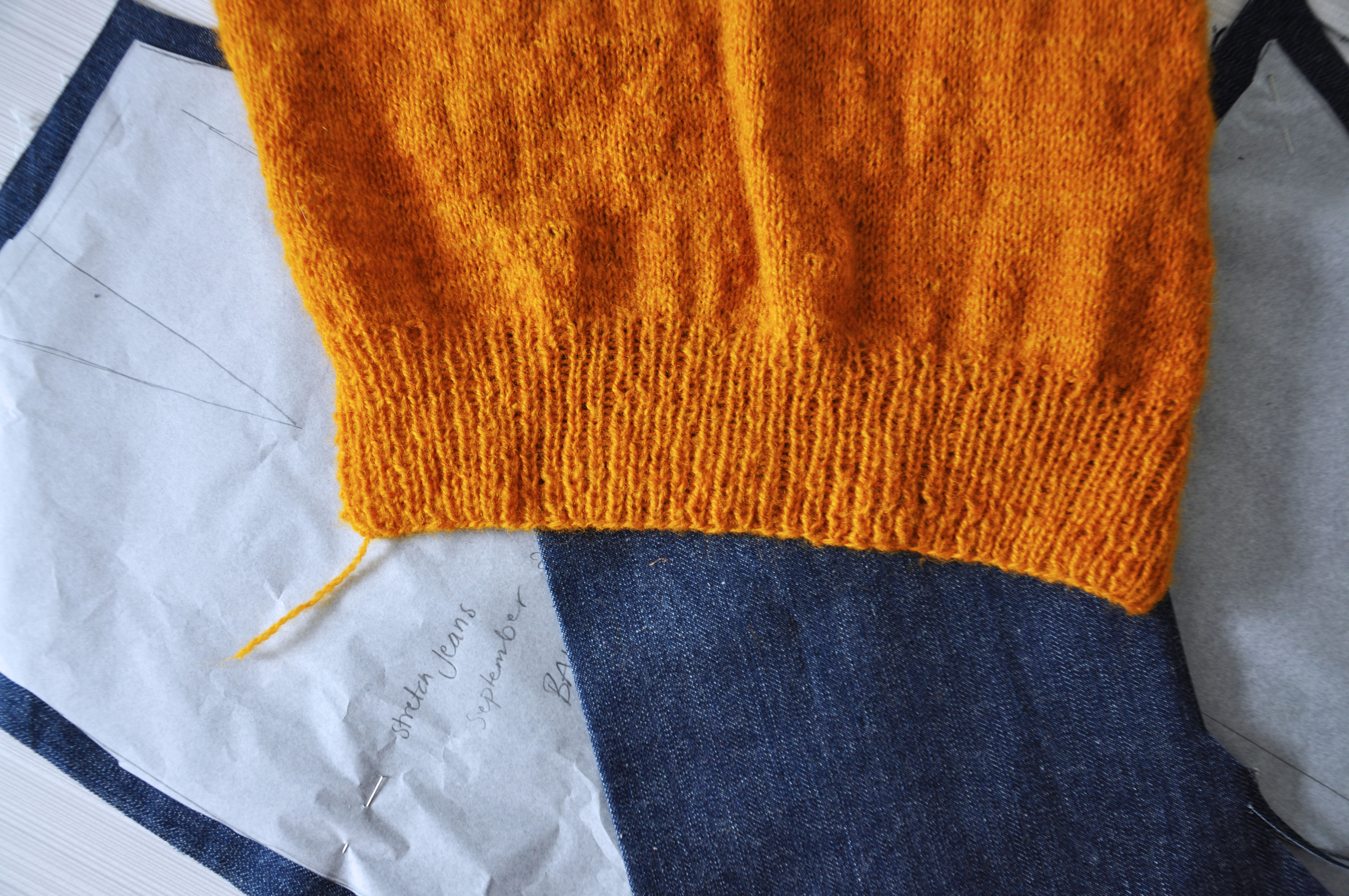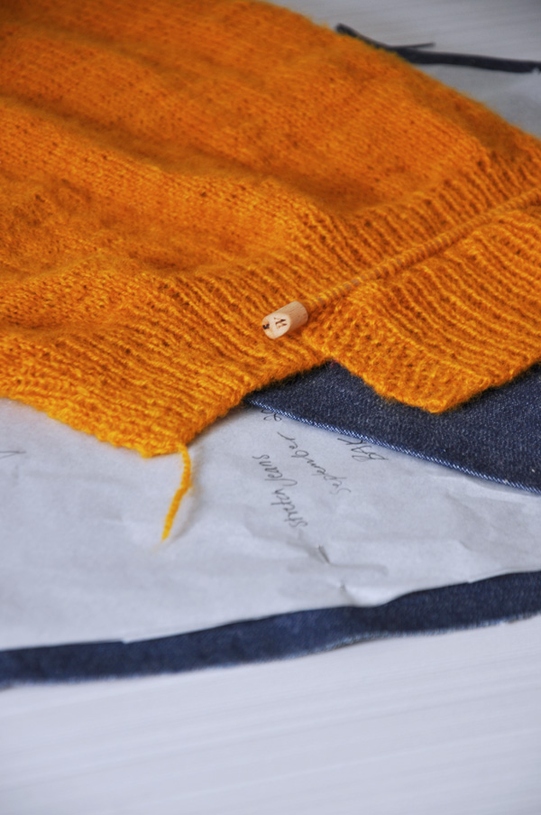 Det har inte blivit så mycket tid i syrummet på sista tiden, jag har helt enkelt haft alldeles för mycket att stå i och varit trött om kvällarna. Men när jag väl finner tiden ligger de här jeansen färdigtillklippta på arbetsbordet. Jeansen kommer förmodligen bli färdiga innan tröjan är färdigstickad men så småningom tror jag de kommer blir riktigt snygga ihop. Mörkblå denim och ockragult är så rackarns fint tillsamans. Perfekt till hösten med sina mättade färger så jag får nog allt lägga på ett kol med båda om jag ska hinna ha dem tillsammans innan vintern är här. För jisses vad tiden går snabbt.