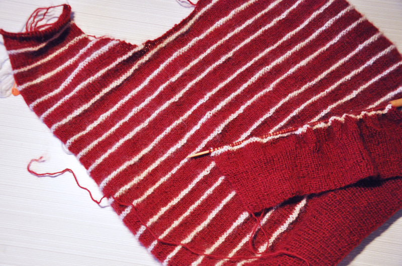 /This is what I’m doing during the evenings lately. A striped jumper in a lovely rubyred shade. I think I will make it short sleeved, allthough I’m not sure yet. Maybe it’s a bad idea for the swedish weather to have a wooljumper with short sleeves? I have some more time before the backpiece is ready however to make the final decision./
