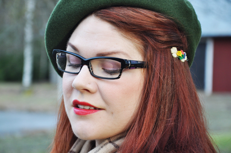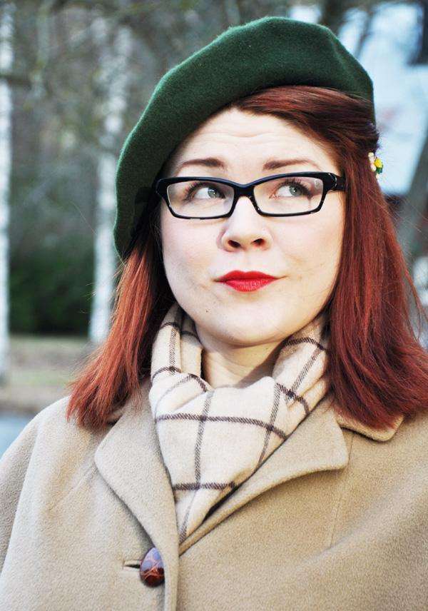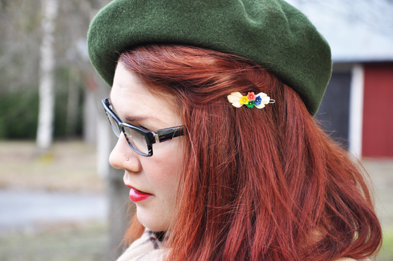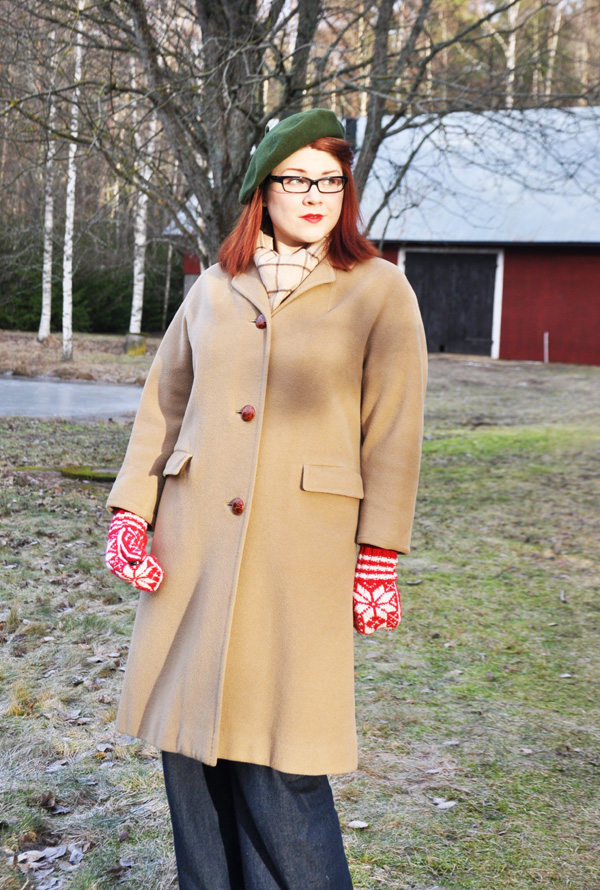 Yesterday we went away to town to make some businessarrends. I wore my new green beret and my favorite camelhaircoat to defeat the cold. I wore my mommas hairbarette for the first time, she used to wear it to school in the 50s.