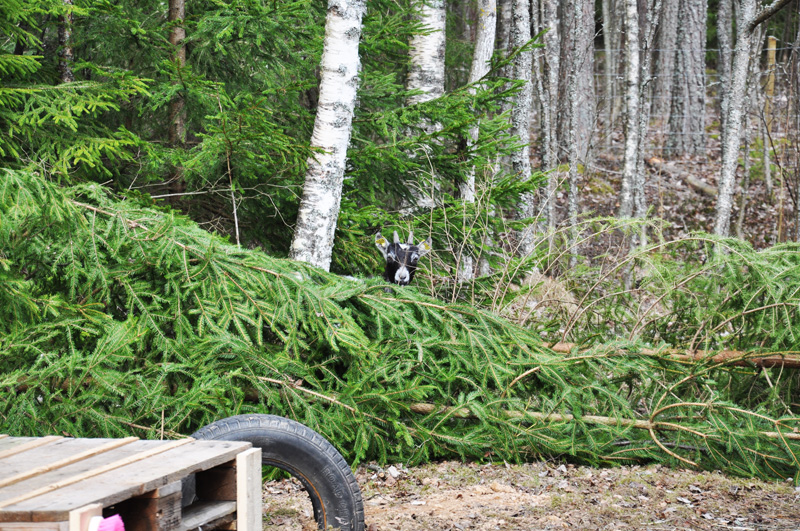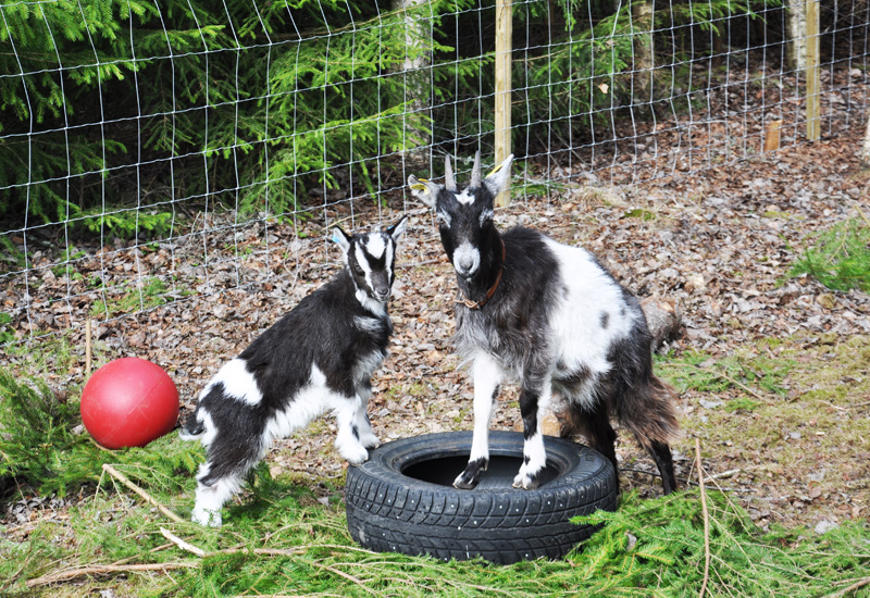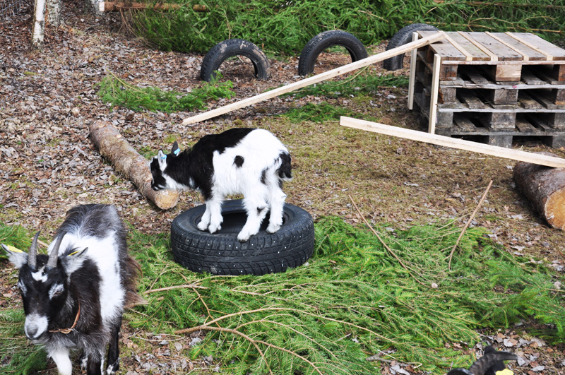 Det var inte bara matplatser har vi byggt. Det måste ju finnas lite stimulans i hagen utöver granarna de har att gömma sig i och äta på. Ett gäng pallar fick bli ett hopp-bord, en stock och en bräda blev helt plötsligt en gungbräda som killingen speciellt gillar att gå fram och tillbaka på.  Gamla däck fick tjänstgöra som ytterligare hoppleksaker. Räfflorna i däcken ger bra fotfäste och gummit i däcken ger lite svikt när man hoppar. I veckan ska jag köpa takpapp och häfta fast på spången till hoppbordet och gungbrädan. Den riviga ytan ger både fotfäste samt fungerar som fotfil på deras klövar.