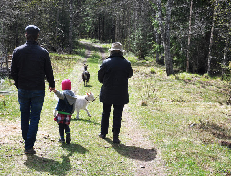 Igår var det en spännande dag. Jag åkte nämligen iväg på en utflykt med mamma, svåger och systerdotter och kom hem med en vit liten Pelle. Mina get-tjejer behövde ha en bock i sin flock och jag hade hittat en fin liten bockkilling åt dem. Han bodde en bit bort så vi gjorde det hela till en dagsutflykt med picknickkorg och hela kittet. Efter att ha letat oss fram genom skogarna kom vi till slut fram till ett hus långt in i skogen på gränsen till Dalarna.