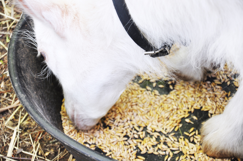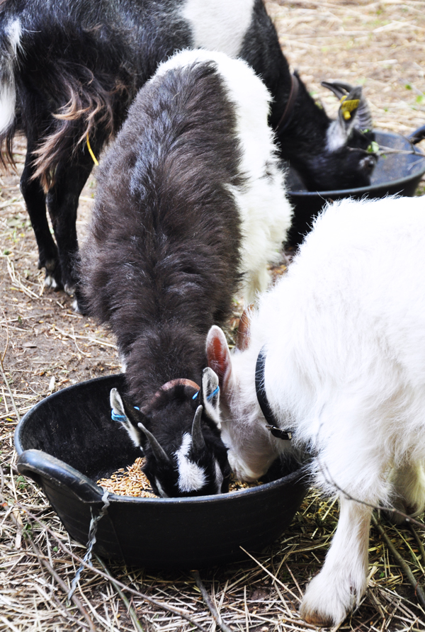De små står gärna med fötterna i matskålen, i början flyttade jag på de små fossingarna åt dem men till slut tröttnade jag eftersom de hamnar där till slut ändå. Jag ska istället bygga ett mattråg som sitter på utsidan av staketet, med lagom stort uttrymme för getterna att få ut huvudet och äta sin mat. Då kan de stå uppradade snyggt och prydligt när de äter utan att sätta upp sina lortiga små fötter i maten.