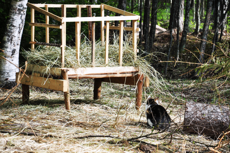 Även katten gillar att vara i gethagen. Fåglarna har nämligen upptäckt att de spiller en hel del av sin mat. Katten gillar ju fåglar så det är klart han märkt det med. Tursamt nog för fåglarna tycker getterna att katten är väldigt rolig att jaga ibland så det blir inte så värst mycket jaktlycka…