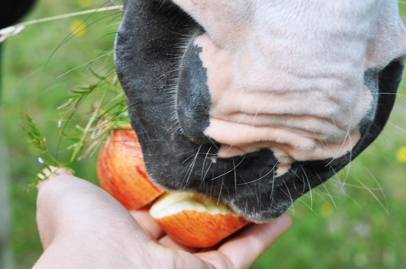 Kansas tar sig inte ens tid att tugga ur munnen på gräs innan han tar sitt äpple. Den där sammetsmulen alltså. Världens finaste..