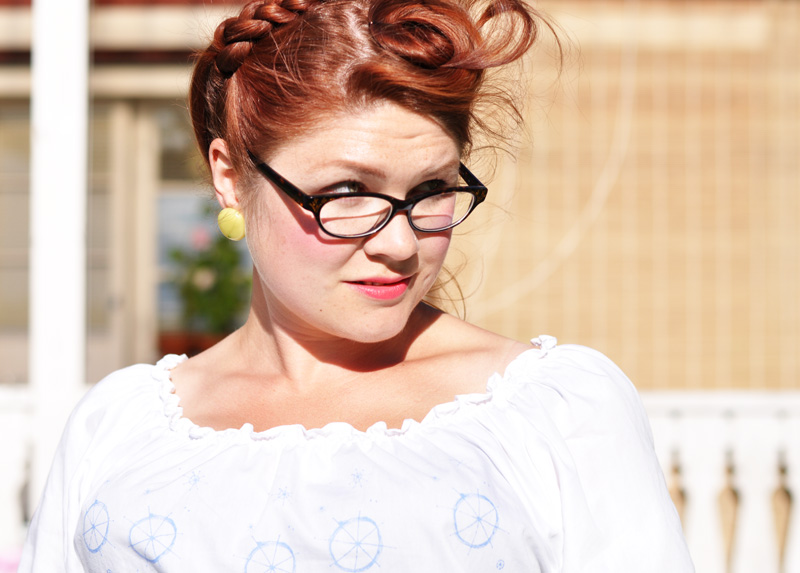 /This was my outfit a hot day last week. The jeans skirt are so comfy and the peasant blouse was an old one I made but haven’t used so it was new to me. The red belt I made the other week is being used most frequently, red really is a nice accent-color. On hot days I love to braid my hair like this. My best hair tip for dry hair at the moment is to on the last day before washing squeeze in a handful of coconut oil in the ends and then braid it and have it like that over the day and wash it in the evening. /