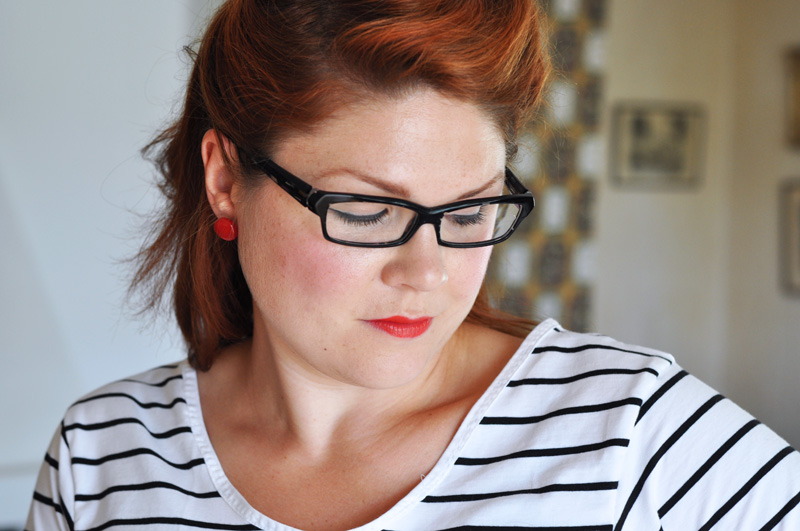 /I made this ensemble a couple of days ago. I like this model on skirt for everyday wear. Both easy to make, flattering with the simple A-line silhouette and very comfortable to wear. I decided to make red accent to the khaki green cotton twill. The inside front pocket I made in the same type of fabric but the bright red and the red buttons I realized would be perfect after the pockets where all done. The everyday skirt needed a everyday top to match so I took out some striped cotton jersey and made a simple but oh so needed t-hirt with long sleeves.. I think I will have to make some more, it was quite fun to sew in jersey as a change../