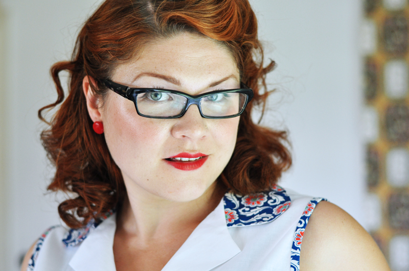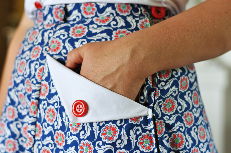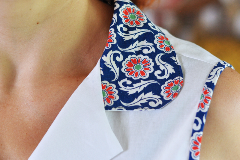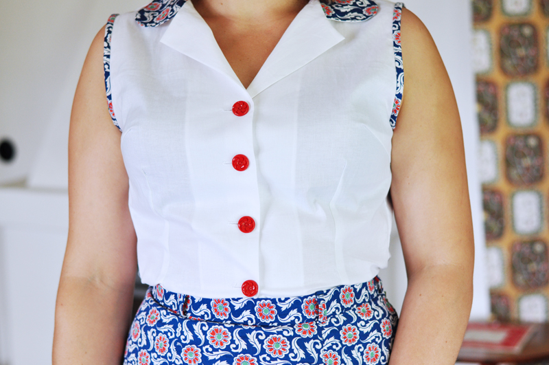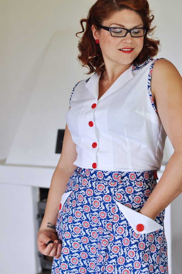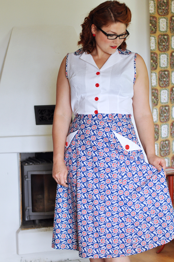 När kjolen var färdig insåg jag att en matchande blus var precis vad den behövde. Eftersom jag bara hade yttepyttelite tyg kvar gjorde jag bara krage och kantband i ärmhålen i samma tyg som kjolen. Själva blusen blev istället i samma vita bomullstyg som fickdetaljerna.