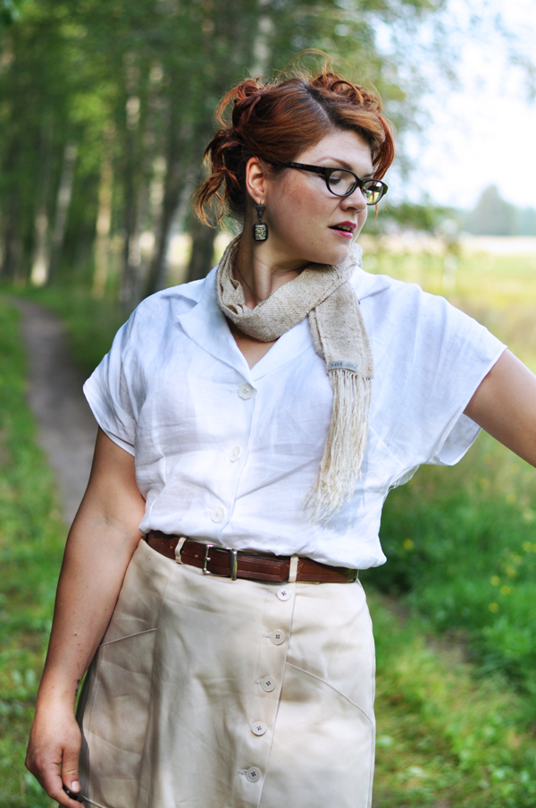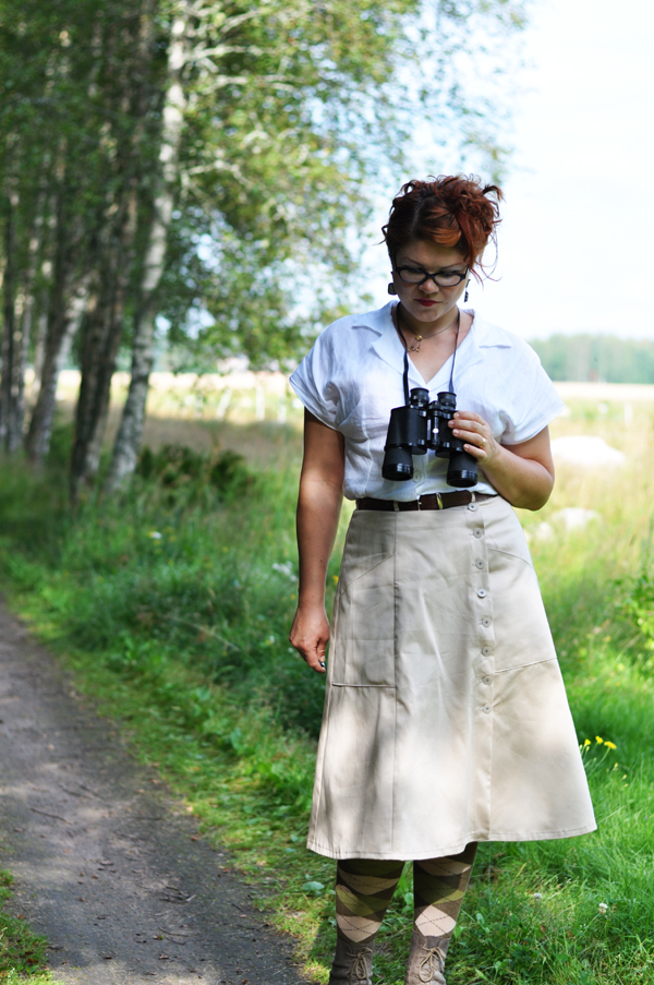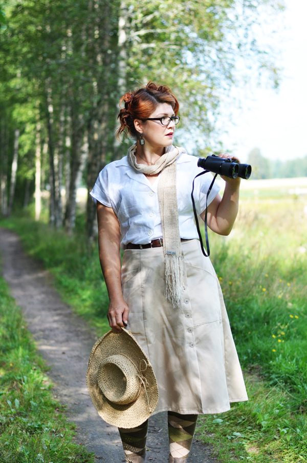 /When I was younger I was deeply fascinated by Egyptology and watched Indiana Jones and the Mummy over and over again wishing I could look like the heroine Evie. Well now when I make my own clothes I actually can, I can’t understand why I didn’t make myself an outfit like this before cause I love it. It began with me wanting to make a linnen blouse to wear in this heatwave we are having here in Sweden at the moment, when it was finished I realized it would be perfect with a light khaki-coloured skirt and that was that. Paired with my grandpa’s old binoculars a straw hat and a silk scarf I’m ready for all sorts of desert adventures.!/