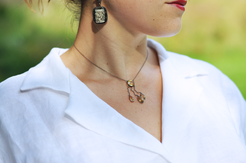 Halsbandet har jag fått av finaste tant Sonja, lite för fint för att ha på sig när man är ute och flänger kanske. Men jag tyckte färgen på stenarna passade så bra till resten så det fick åka på en kort stund. Skarabé-örhängena är gamla och jag köpte dem i min värsta egypten-period, de var clips från början men jag lämnade in dem så de fick silverkrokar istället för att spara på örsnibbarna.