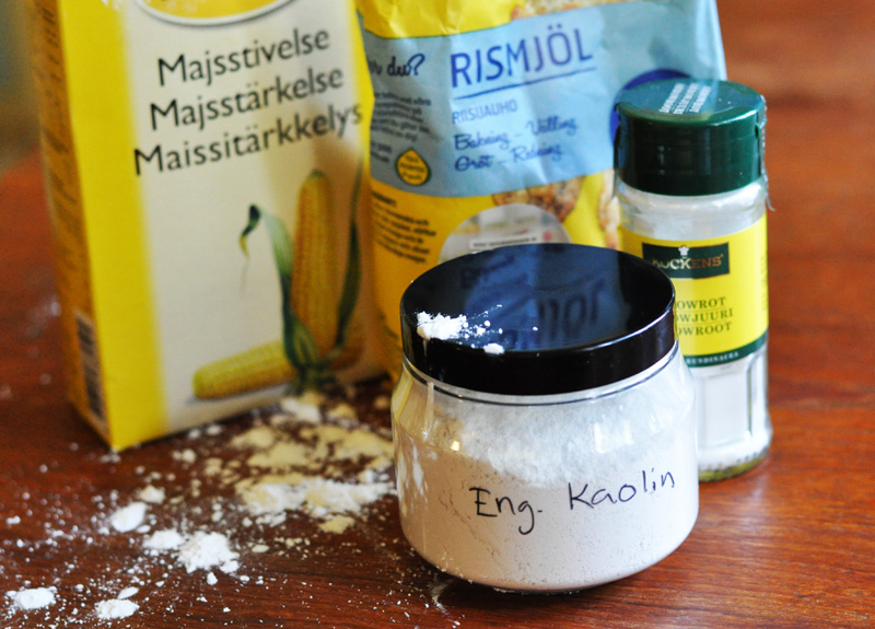 Det finns allehanda olika recept på kroppspuder där ute om man söker på internet. Man får helt enkelt känna sig fram lite till vad man själv föredrar. För min första provsats blandade jag 3 delar maizena med 2 delar rismjöl, 2 dela kaolin och 1 del arrowrot. Jag tillsatte även lite bikarbonat då det motverkar lukt och verkar som deodorant. Jag kommer nog inte fortsätta med det dock för jag tyckte bikarbonaten hade lite för grov känsla och jag vill att mitt kroppspuder ska vara silkeslent mot huden. Både maizenan, arrowroten och rismjölet finns i vanlig matvarubutik. Även om jag hellre hade velat haft ett mer finmalet rismjöl som man hittar i asiatiska butiker funkade det från Risenta bra det också. Kaolin är en vit lera, väldigt fin i texturen och silkeslen som bland annat används mycket inom kosmetikaindustrin. Jag fick dock tag på det från en av Färgkrafts gömmor då vi använder kaolin när vi gör reserveringar vid textiltryck.. Kaolin används även vid tillverkning av keramik och porslin. Roligt när det finns så många användningsområden för något. Häll alltihop i en burk med lock och skaka ordentligt så allt blandar sig. Se bara till att inte andas in pulvret, man vill ju inte råka ut för stendammslunga bara för att man gillar att använda kroppspuder….