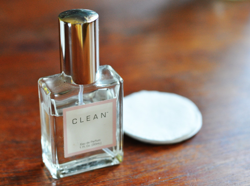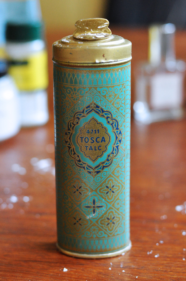 När pudret är färdigblandat så kan man tillsätta doft om man vill. Väldigt enkelt, bara spraya lite parfym eller droppa eteriska oljor på en bomullsrondel och låta den ligga med i burken i ett till två dygn. Jag valde att ta min Clean-parfym för en härligt tvålig doft på mitt puder.. Skaka om någon gång ibland och vips så har man ett härligt doftande kroppspuder. Jag hade dessutom en fin gammal talkflaska efter mormor som jag hällde upp mitt puder i. Förut har jag bara haft den här som prydnad på mitt sminkbord men det är ju självklart mycket roligare när det finns något i också..