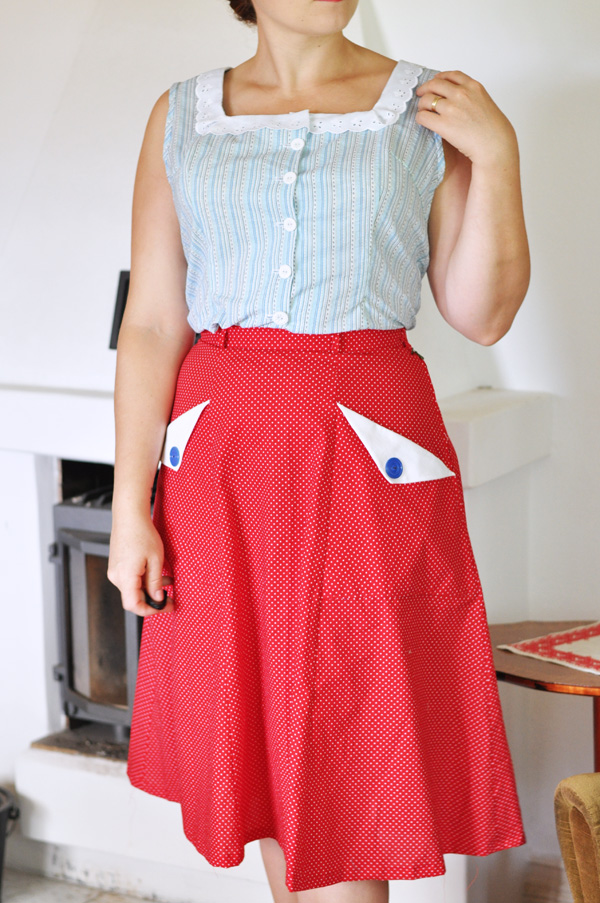 Är inte det typiskt så säg!? Men jag är ju iallafall stadd till nästa sommar om det inte kommer en varmfront i slutet av augusti. Fickor på kjolen är ju min favorit nu så givetvis fick det bli det på den här röda också. Blåa knappar eftersom blått, vitt och rött är en av de bästa kombinationerna på somriga plagg..