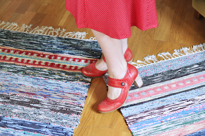 De röda slejfpumpsen passade perfekt till kjolen och det var trevligt att ha på sig högklackat en stund… Även om jag får byta så fort jag tänker gå ut (vi har nydränerat här hemma och därmed både sandigt och lerigt över hela tomten, inte finsko-anpassat alltså)…