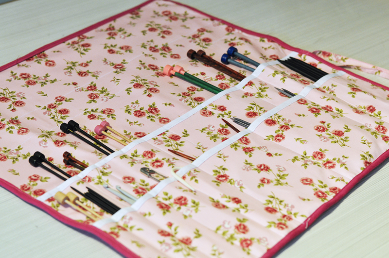 Ett band av rosentyget att knyta ihop med och vips har man en smidig och bra förvaring till sina käraste stickor!