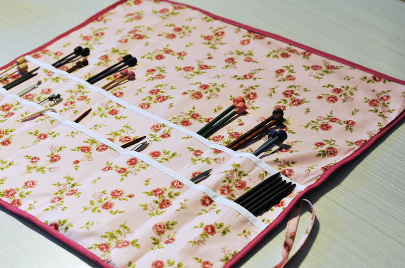 /I made this last night! Been wanting a knitting needle roll for a very long time to get me more organized with my knitting needles but it wasn’t until last night I finally got around to make one. It turned out very good actually. With a pink sturdier fabric on the outside and a nice rose patterned fabric on the inside it became both handy and sweet. The bias tapes finished the edges and made the whole thing a very fast thing to sew. Love bias tape for this sort of things../