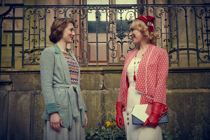1930-tals mode när det är som bäst. Den där stickade jumpern som Muriel har på sig liknar väldigt mycket mönstret i randningen på den här provlappen, fast andra färger förstås.. Det är samma typ av mönstring som i den klassiska Victory-jumpern.. Mönster till Victory-jumpern finns här på V&A’s sida med vintagemönster, längst bak om man vill sticka den. Rackarns snyggt!