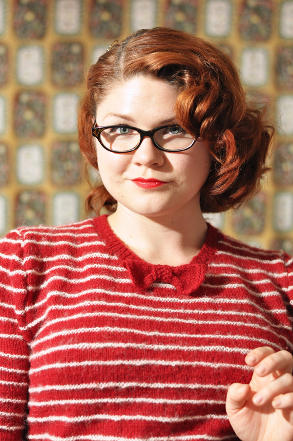 /I cut my hair the other day. After saving the lengths for some time I got totally bored with it and told my hairdresser to just chop it off.. Very nice and more manageable with short hair.. I’m not long hair material I think getting vexed with it being in the way all the time and not getting the curls to last very long… Finally it’s cold enough to wear this jumper that I knitted last autumn, wearing it makes me feel very 30s secretary in a Miss Lemon from Poirot sort of way, works good with the shorter hairdo as well…/