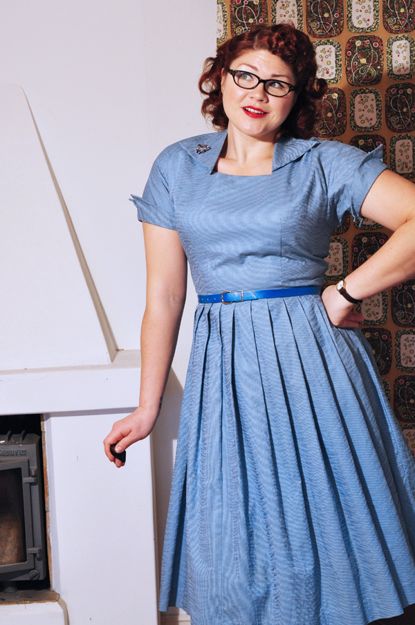Igår var 4års kalas för min söta lilla systerdotter. På kalas är det ju klänning som gäller så jag tog fram den här ljusblå festklänningen från 50-talet som jag använt alldeles för lite (knappt någonting faktiskt), lade håret och invigde mitt nya hårspänne med strass. Jag hann till och med smälla av några foton innan det var dags att blåsa iväg och äta tårta och leka med ballonger!