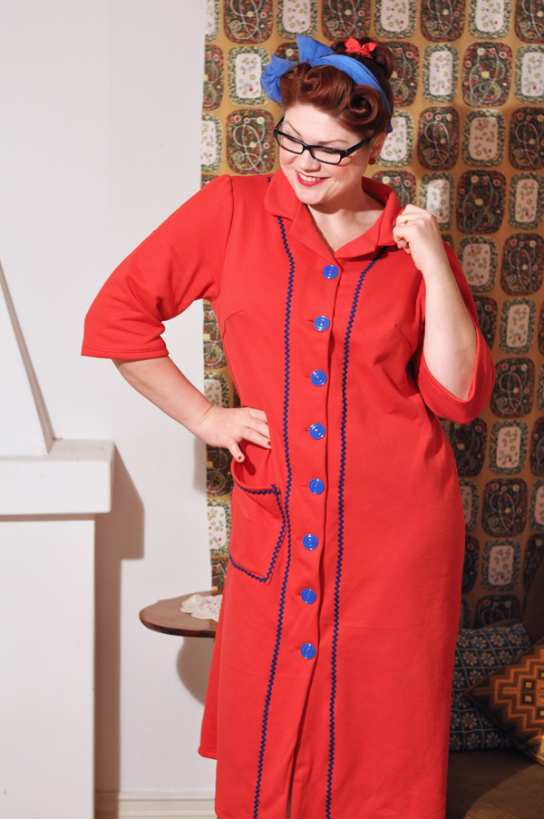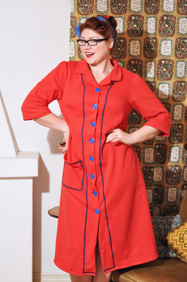 Vips och hej, helt plötsligt hade det gått två veckor utan en enda uppdatering. Men jag behövde en liten bloggvila då jag ägnat större delen av ledigheterna kring jul med att vara krasslig och ligga på soffan. När jag låg där och vilade mig insåg jag en sak. Nämligen en tämligen stor avsaknad av mys-kläder i min garderob. Så när jag tröttnade på att hasa runt i mina pyjamasbyxor tog jag tag i saken och skapade mig en mys-klänning. Som en blandning av morgonrock och ”house-dress” kan man säga. Med så få sömmar så möjligt och en enkel rak modell som går rackarns snabbt att sy ihop, tänkt att bäras antingen med skärp eller utan. För att göra det extra mysigt så här i vinterkylan valde jag dessutom att sy den första i ett tjockt och gosigt ”jogging-tyg, det vill säga samma sorts tyg som i luvtröjor och jogging-byxor.. Ska det va så ska det va tänkte jag och det är ju rackarns trevligt att mysa hemma utan att se ut som (och framförallt känna sig som) en lurk…