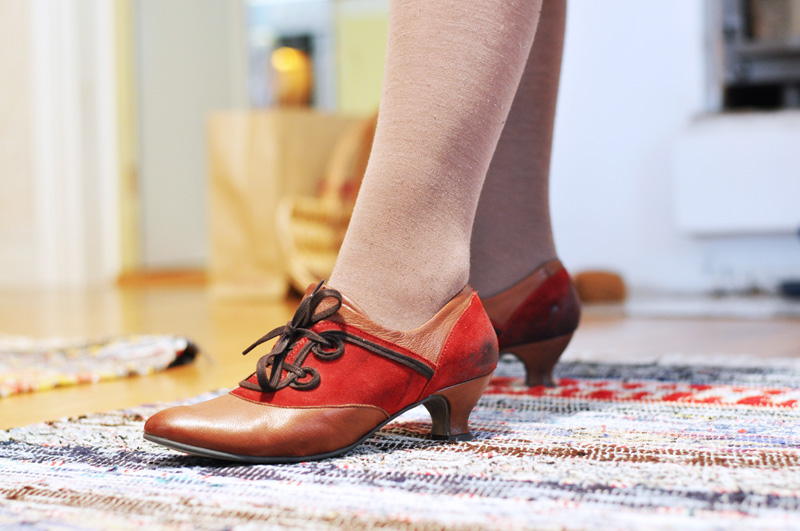 Favoritskorna ”Mable” från Dkode för några år sedan passar ju desutom som handen i handsken till stilen så de fick åka fram ur garderoben de med. Rackarns bekväma är de med sin låga välvda klack för att inte tala tjusigheten..2501154/I’ve been more drawn to the early 30s lately and made a dress strongly inspired by the ”Factory dress” that I mentioned before. Of course I made a few alterations to my model, like kimono sleeves and I chosed not to go with the dropped waist since I always feel peculiar and bulky in dresses with dropped waist. But now I think I might have a go anyway so maybe I’ll try it for the next one I make. This first prototype I made in a nice and warm cotton flanell, perfect for this winter and the best thing to wear when you want to feel cosy.. Ad a scarf to the hair and my favorite shoes (called ”Mable”) and we have a winner combination..Think I will continue to sport this sort of style all through spring. /