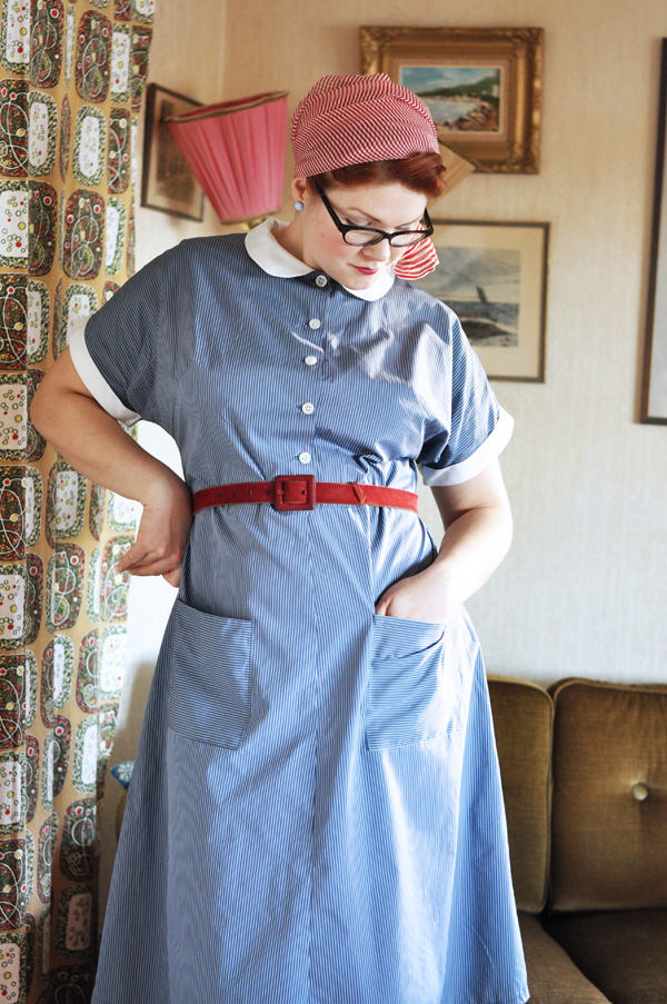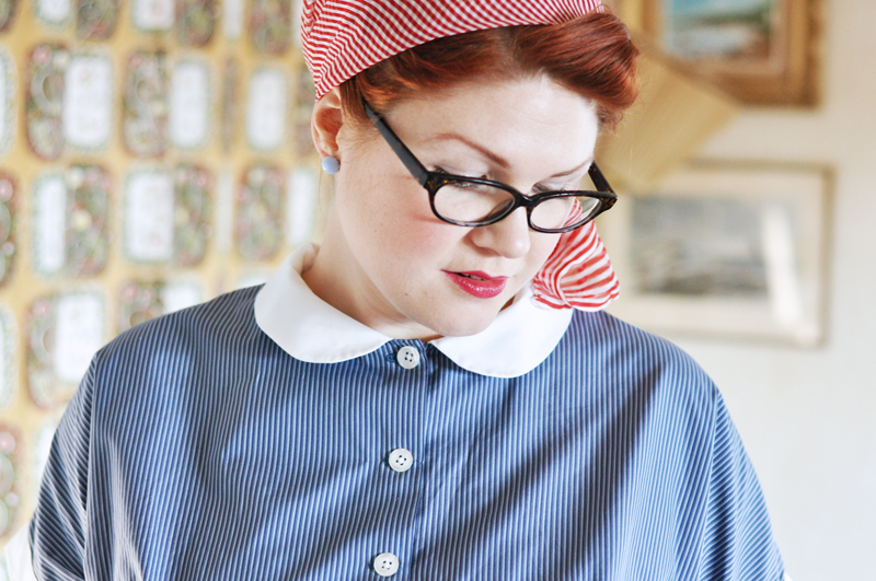 I ett av alla mina fina skjorttyger som jag fyndade den där gången då jag köpte upp ett lager efter en affär som lade igen. En mellanblå glansig bomull med små ränder. När jag hittade en redan uppsydd krage (som jag antagligen tänkt ha till något men sedan ändrade mig) beslöt jag att den skulle få hamna på den blå klänningen. När jag sedan satte på ”manschetter” på ärmarna i samma vita bomulls-poplin och sytt i de vita pärlemorknapparna insåg jag att det i princip hade blivit en sjuksköterske-klänning av det hela, utan att jag märkte det under tiden jag sydde. Men inte gör det mig nått, den klassiska sjuksköterske-looken faktiskt ganska tjusig enligt mig..