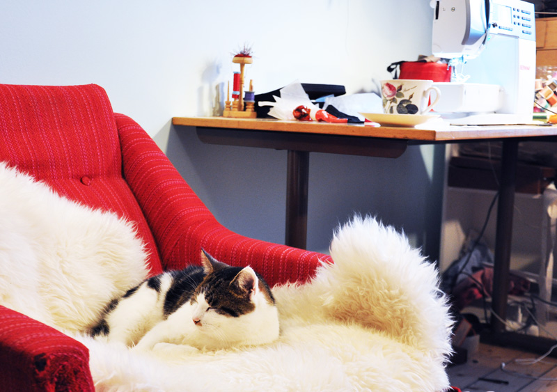 /I realized today that all my comfortable underwear was in the laundry so I took my teacup and went up into the sewingroom before going to work an made myself a new pair of undies. It’s the easiest and funniest thing to make I think. And there isn’t any reason to walk around in uncomfortable underwear, not even on a gloomy tuesday like this./