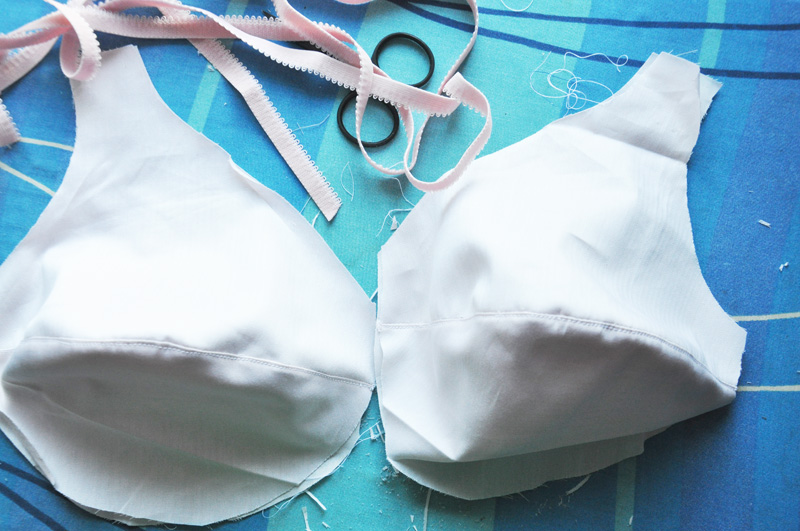 När jag tröttnat en smula på trostillverkningen klippte jag till en ny bh också (två faktiskt eftersom jag gillar att göra flera samtidigt). Inte färdig än visserligen men snart så. Ljust rosa fick bli melodin, det ändå är favoritfärgen på underkläder, klassiskt och bra. I själva verket borde jag nog allt skaffa mig lite stretch-bomull i puderrosa så jag kan göra matchande trosor till mina bh-ar. Jag menar när man ändå har möjligheten känns det ju lite snopet att ha så många olika färger hit och dit. Men så är ju tros-tillverkning det optimala att göra med stuvbitar som inte kan bli något annat och då är det är ju inte konstigt att det blir lite av ett färgglatt mischmasch i underklädeslådan till slut.