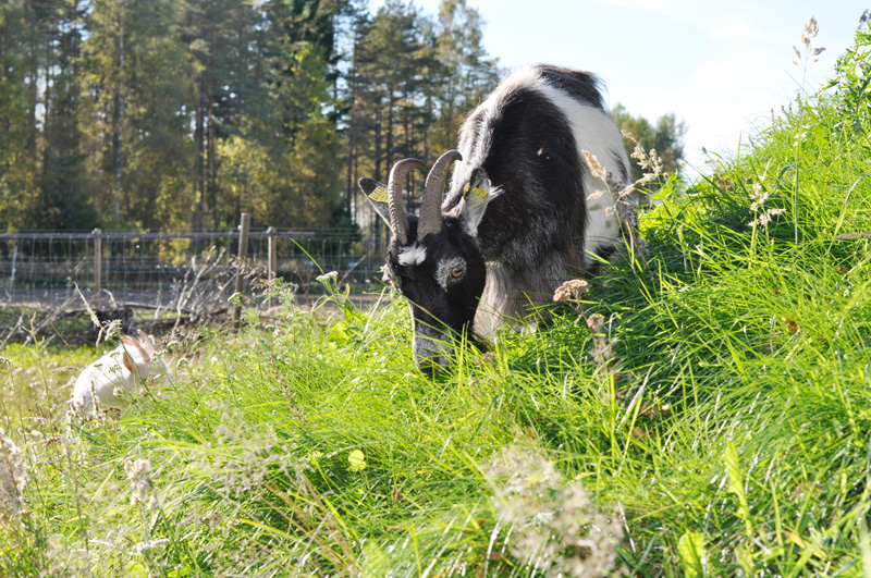 Förutom äppleträden är infiltrationen vi grävde förra året en riktigt bra plats att äta på också, vilket uppmuntras för att spara på min stackars trädgård . Eftersom jorden blivit vänd där och del av fyllningen är sand från ängen blev det en väldigt stor artrikedom bland gräset som växte upp. Ängsblommor och gräs av alla möjliga slag och ett riktigt smörgåsbord för en get… Och vilken bonus sen att det är en stor kulle som man kan se långt ifrån, för att klättra och komma högre upp är ju sånt som getter älskar…