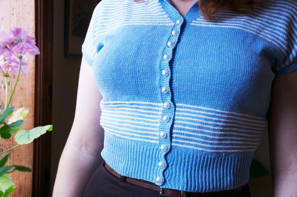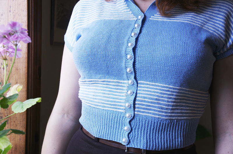 Den ljusblå tröjan är bland det finaste jag äger, stickad av mormor på 40-talet och jag fick den av henne i högstadiet då jag inte hade begrepp om vilken dyrgrip det var utan använde den en hel del. Jag tyckte ju den var riktigt tjusig redan då, men var kanske inte riktigt lika försiktigt lagd. Den klarade sig hursomhelst igenom den tiden utan att råka ut för några skador. Nuförtiden har jag nästan aldrig på mig den eftersom jag är rädd att den ska bli sliten eller gå sönder. Istället tar jag fram den ibland och njuter av vad fin den är eller kanske, ytterst kanske har på mig den ibland vid speciella tillfällen. När jag fått iordning i mitt syrum i det nya huset skall jag göra en hedersplats åt den på en galge på väggen (långt från fönster med farliga solstrålar som kan bleka) så jag kan se den hela tiden och bli glad av denna lilla ljusblå karamell.