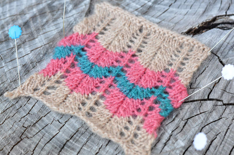 Eftersom jag inte kunde hejda mig gjorde jag en provlapp så fort vi fått ihop några omgångar provfärgningar.. Jag tänkte sticka en jumper med det här spetsmönstret så fort jag blivit klar med min rutiga gröna cardigan. Jag ville prova något nytt den här gången och tog lite andra färger än jag brukar dras till, men jag tycker de blev rackarns snygga ihop.